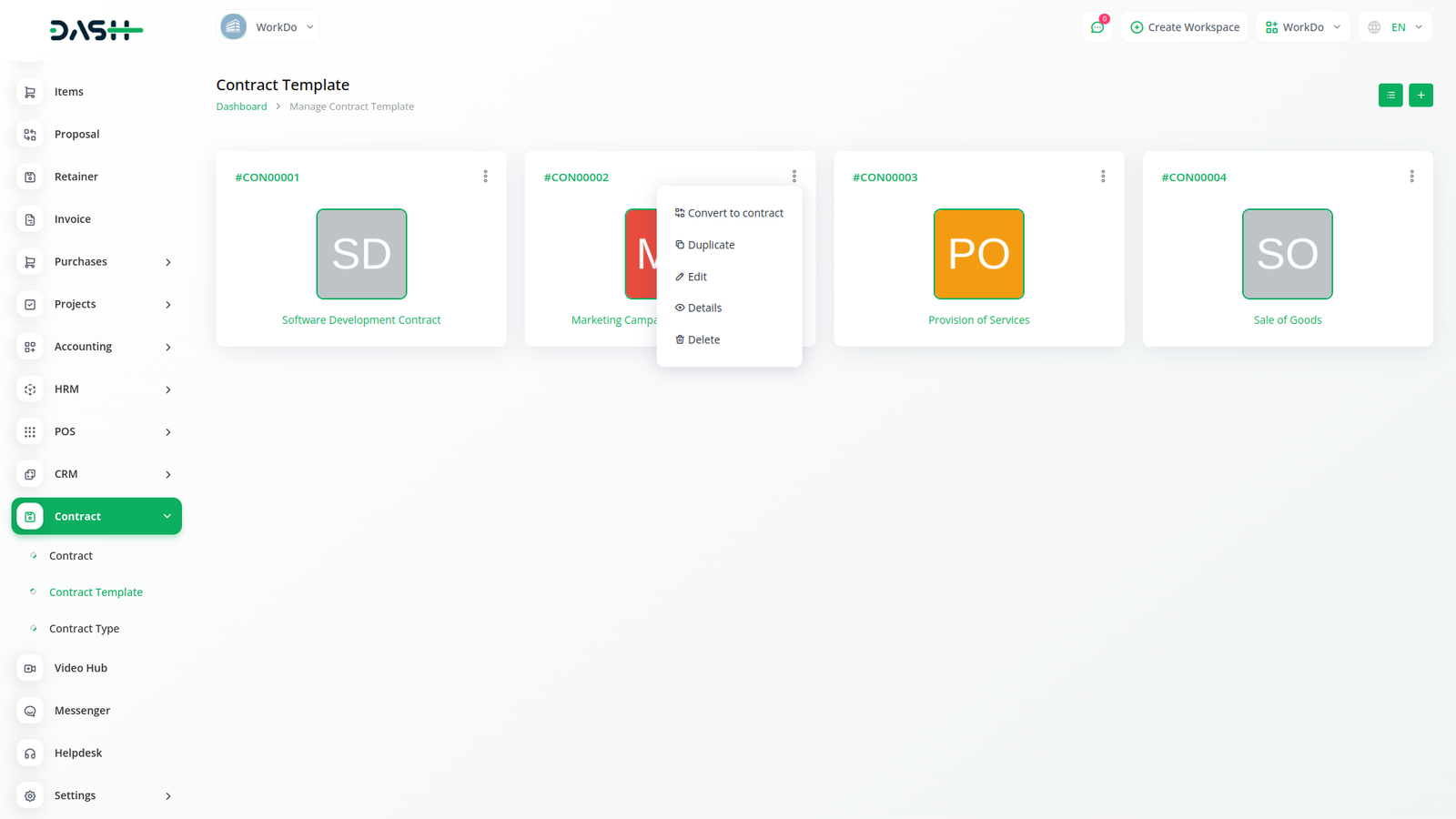 Save time and streamline your workflow by seamlessly converting templates into active contracts within Dash SaaS. When initiating a new contract, simply select a pre-existing template from your library, and watch as the contract is automatically generated based on the templates predefined structure and parameters. This streamlined process eliminates the need for manual data entry, ensuring consistency and accuracy throughout your contract database.