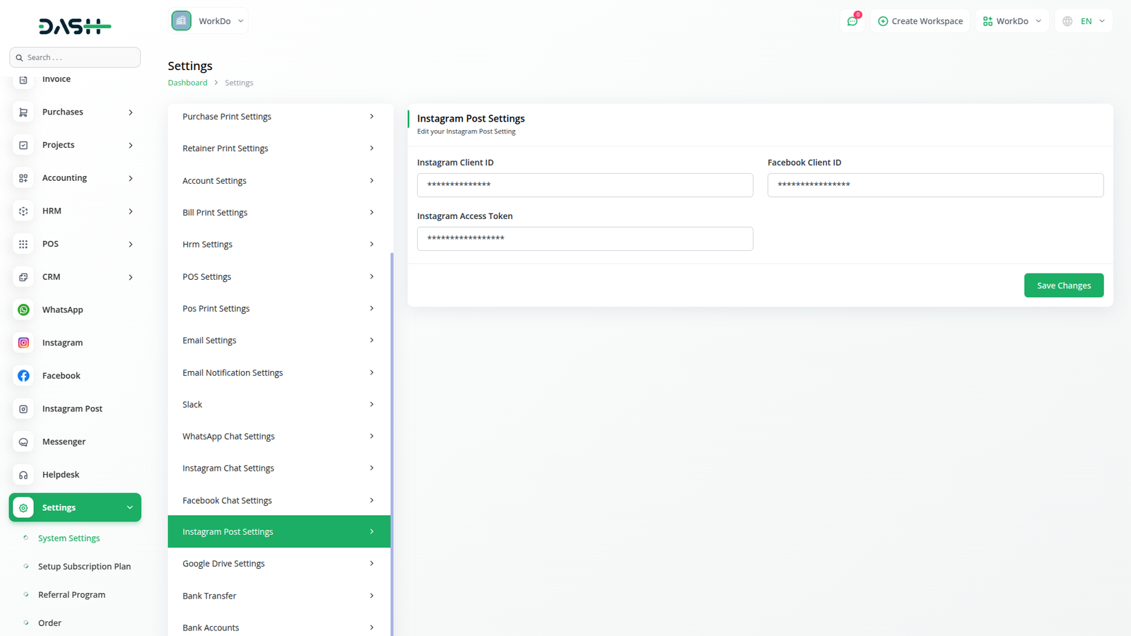 Managing your Instagram content becomes effortless with the Dash SaaS Instagram Add-on. Instead of switching between platforms, you can integrate your Instagram account directly into the Dash SaaS portal by entering your Instagram Client ID, Facebook Client ID, and Access Token. Once set up, you gain full control over your Instagram posts without ever needing to leave the portal. Whether you`re handling a personal brand or managing a business page, this integration allows you to streamline your content creation and posting process, making it more efficient and hassle-free.