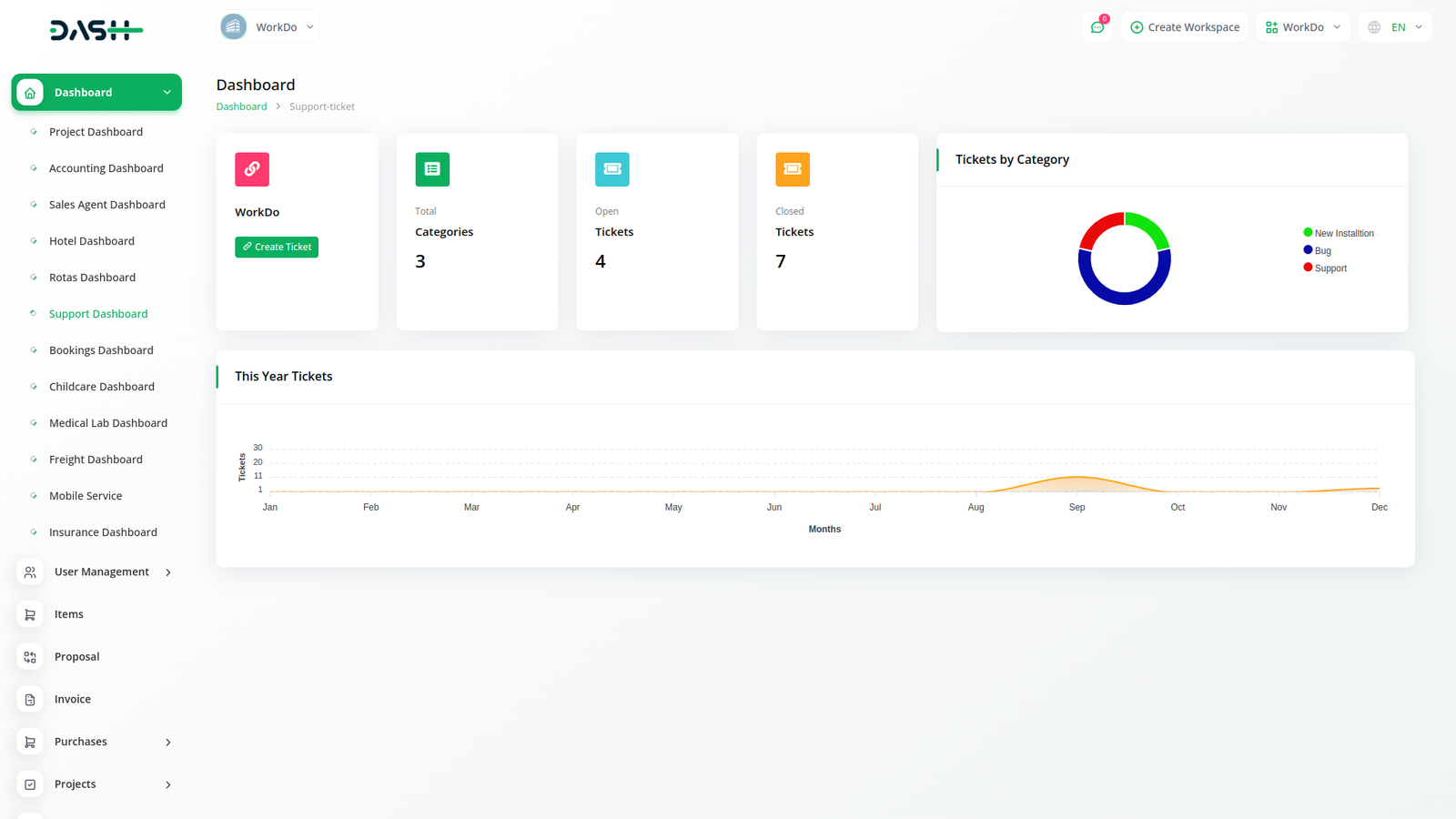 Get easy access to open and closed ticket statistics. A visual presentation of categories and a monthly generated ticket chart are presented.