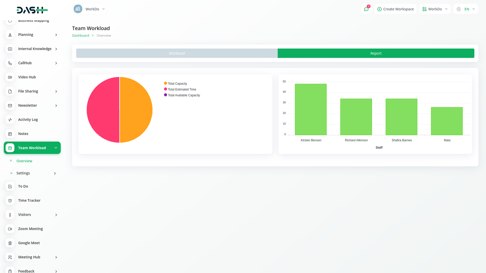 With the Team Workload module, we can find out the total number of hours an employee has the ability to work in a week and the total number of hours worked in these occupations.
