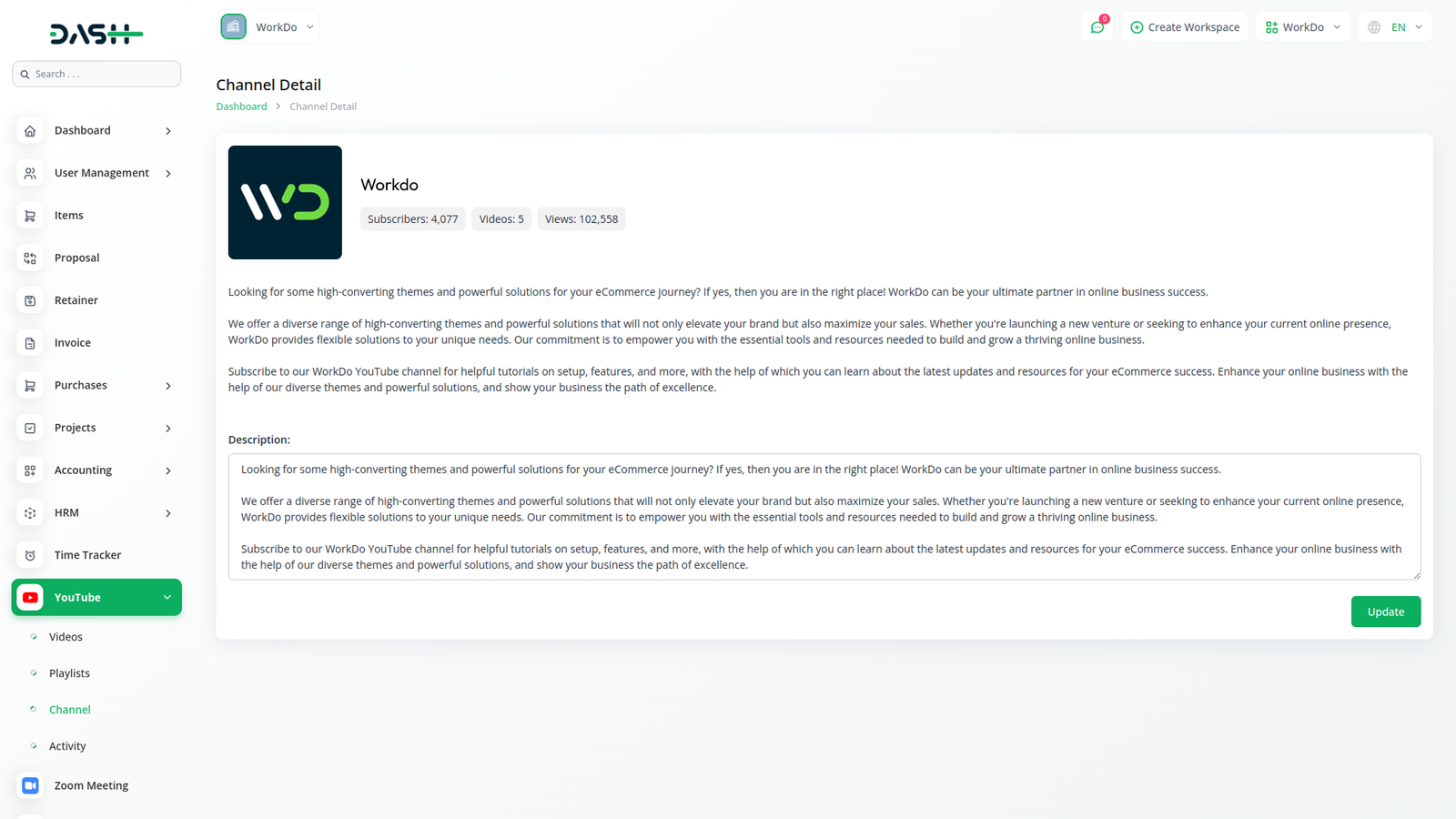 With the YouTube Content Management module, everything you need is available in one place. From managing uploads to tracking activity, this tool streamlines your workflow and optimizes your channel’s performance. Whether you're growing your brand or running a content-driven business, Dash SaaS provides the efficiency and control needed for YouTube success.