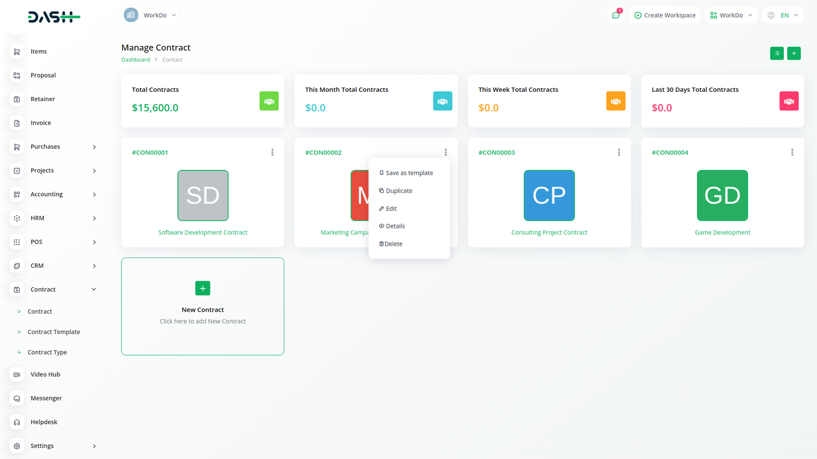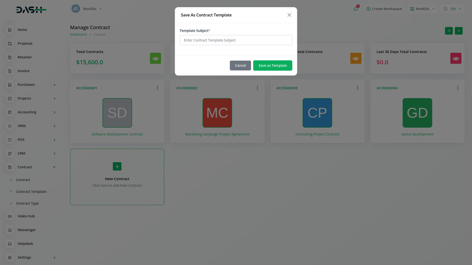 Save time and streamline your workflow by seamlessly converting templates into active contracts within Dash SaaS. When initiating a new contract, simply select a pre-existing template from your library, and watch as the contract is automatically generated based on the templates predefined structure and parameters. This streamlined process eliminates the need for manual data entry, ensuring consistency and accuracy throughout your contract database.