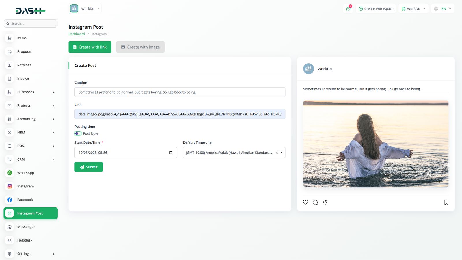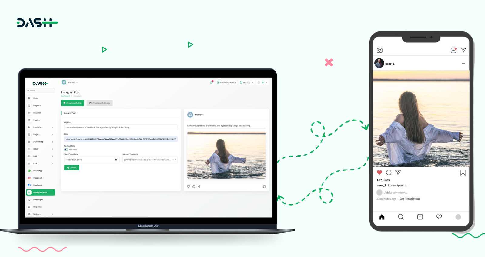 With the Dash SaaS Instagram Add-on, posting content is quicker and easier than ever. You can create posts directly from the portal and publish them on your Instagram account instantly or schedule them for a later time. This scheduling feature ensures that your content goes live at the perfect moment, even if you`re busy or unavailable. Whether you prefer to upload images from your files or generate them via a link, the flexibility ensures that your workflow remains smooth and convenient. The intuitive interface allows you to draft captions, format your content, and preview posts before publishing. By reducing the number of steps involved in posting, this add-on saves time while ensuring consistency in your content strategy, making it an essential tool for businesses and influencers alike.