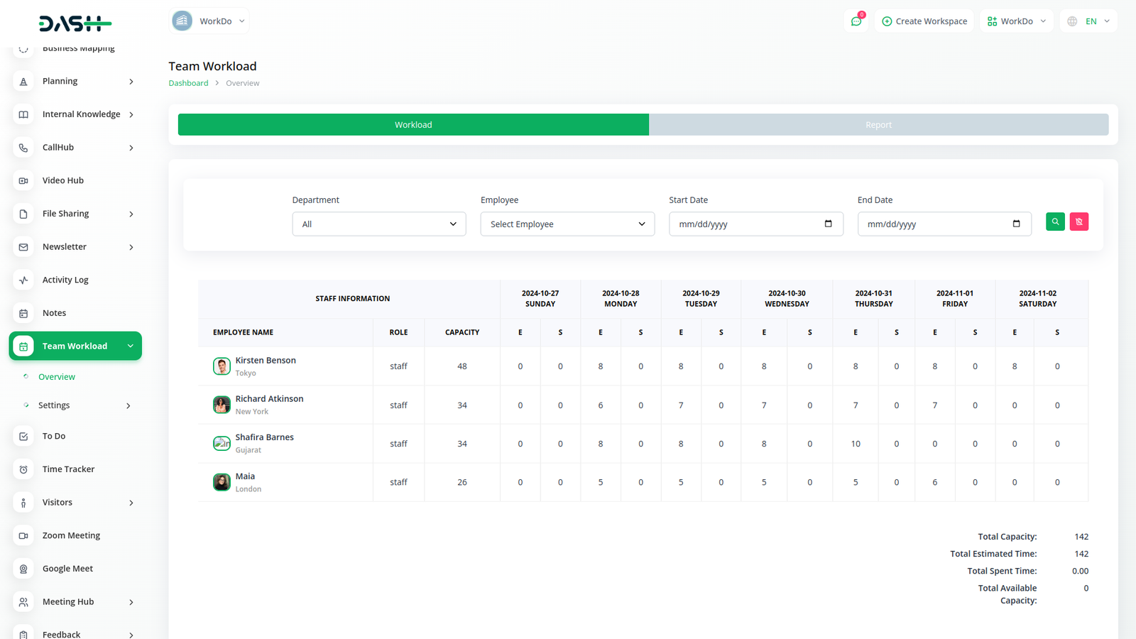 With the Team Workload module, we can find out the total number of hours an employee has the ability to work in a week and the total number of hours worked in these occupations.