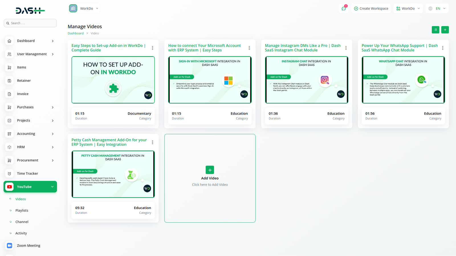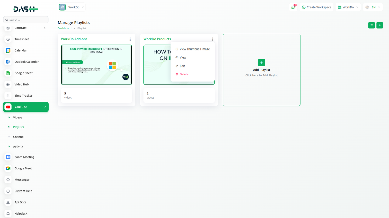The YouTube Content Management module in Dash SaaS streamlines channel oversight, enabling effortless video, playlist, and activity management from one centralized dashboard.